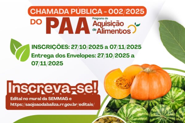 A Prefeitura Municipal de São João da Baliza, por meio da Secretaria Municipal de Meio Ambiente e Agricultura (SEMMAG), publicou o Edital de Chamamento Público nº 002/2025 – PAA Municipal, que visa o credenciamento de agricultores familiares, povos indígenas, comunidades tradicionais e assentados da reforma agrária interessados em fornecer gêneros alimentícios ao Programa Municipal de…