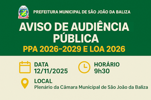A Prefeitura de São João da Baliza e a Câmara Municipal de Vereadores, realizarão no próximo dia 12 de novembro de 2025, às 9h30, no Plenário da Câmara Municipal, uma Audiência Pública destinada à apresentação e discussão das propostas do Plano Plurianual (PPA) 2026–2029 e da Lei Orçamentária Anual (LOA) 2026. O encontro é aberto…